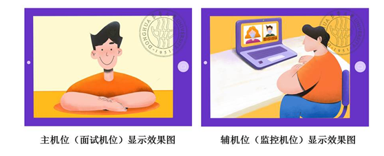 復(fù)試前按要求調(diào)試好設(shè)備,開啟攝像頭,主機(jī)位(面試機(jī)位)從正面拍攝,對(duì)準(zhǔn)考生本人,確??忌p手和頭部完全呈現(xiàn)在拍攝畫面中。輔機(jī)位(監(jiān)控機(jī)位)從考生側(cè)后方45°拍攝,距離1-2米,確保輔機(jī)位能從側(cè)后方清晰顯示考生上半身及復(fù)試環(huán)境,復(fù)試專家組能夠從輔機(jī)位清晰看到主機(jī)位屏幕。屏幕顯示效果圖如下。