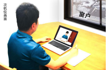 主機位為面試主機位(最好為筆記本電腦或臺式機),面向考生,用于考官對考生的遠程視頻考核。放置面試主機位的書桌應緊貼墻面擺放,主機位攝像頭覆蓋房間門口??荚囬_始時考生將主機位攝像頭環(huán)繞360度,使面試人員查看考場全部場景??忌救苏龑υO備攝像頭,保持坐姿端正,面部、上半身及雙手在畫面中清晰可見。示意圖如下: