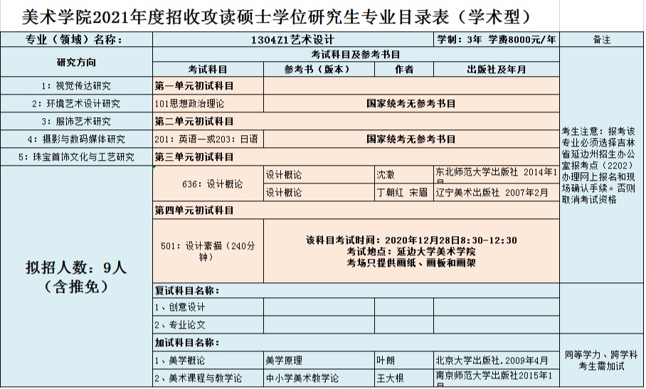 延邊大學美術(shù)學院2021年考研招生目錄及參考書目 發(fā)布時間:2020-09-16 延邊大學美術(shù)學院2021年考研招生目錄及參考書目 上一篇:延邊大學美術(shù)學院2020年考研復試線及復試名單公布 下一篇:延邊大學2021年考研復試安排及復試名單