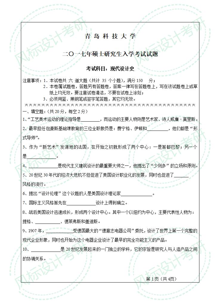 青島科技大學藝術(shù)學院2017年藝術(shù)設(shè)計考研真題:652現(xiàn)代設(shè)計史 發(fā)布時間:2019-09-03 上一篇:青島科技大學藝術(shù)學院2016年藝術(shù)設(shè)計考研真題:652現(xiàn)代設(shè)計史 下一篇:青島科技大學2021年考研復(fù)試分數(shù)線及招生人數(shù)