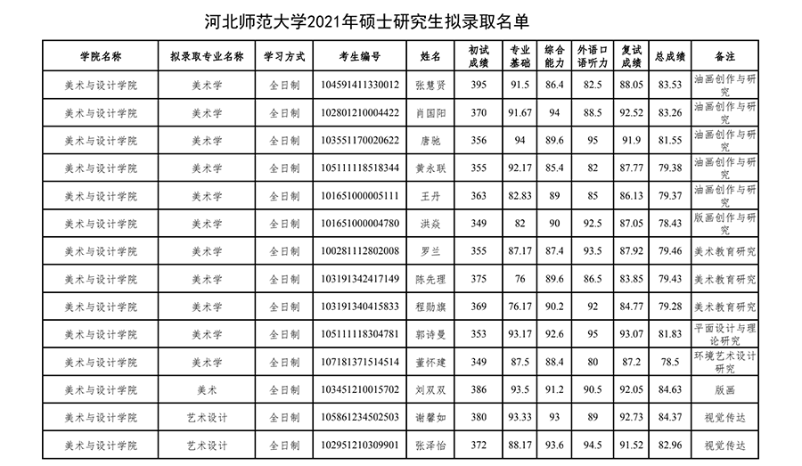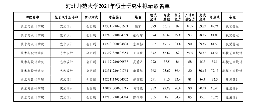河北師范大學(xué)2021年考研調(diào)劑錄取名單(美術(shù)與設(shè)計(jì)學(xué)院) 發(fā)布時間:2021-03-31 河北師范大學(xué)2021年考研調(diào)劑錄取名單(美術(shù)與設(shè)計(jì)學(xué)院) 上一篇:河北師范大學(xué)美術(shù)與設(shè)計(jì)學(xué)院2021年考研錄取名單公示 下一篇:河北師范大學(xué)美術(shù)與設(shè)計(jì)學(xué)院2022年考研招生目錄及參考書目