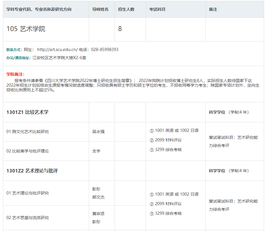 四川大學(xué)藝術(shù)學(xué)院2022年博士研究生招生目錄 發(fā)布時間:2021-11-16 四川大學(xué)藝術(shù)學(xué)院2022年博士研究生招生目錄 上一篇:四川大學(xué)2022年考研初試成績查詢時間公布 下一篇:四川大學(xué)藝術(shù)學(xué)院2022年普通招考博士研究生招生簡章