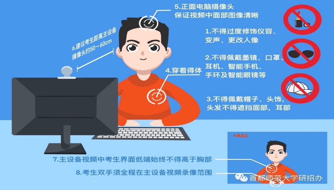 4.考生復(fù)試時(shí)正向面對(duì)第一機(jī)位,保證頭肩部及雙手出現(xiàn)在視頻畫面中,保證面部清晰可見(jiàn),頭發(fā)不得遮擋面部、耳部,不得佩戴帽子、耳飾、口罩、耳機(jī)、智能手表、手環(huán)及智能眼鏡等。第二機(jī)位須保證視頻呈現(xiàn)考生腰部及以上部位和第一機(jī)位的屏幕圖像。
