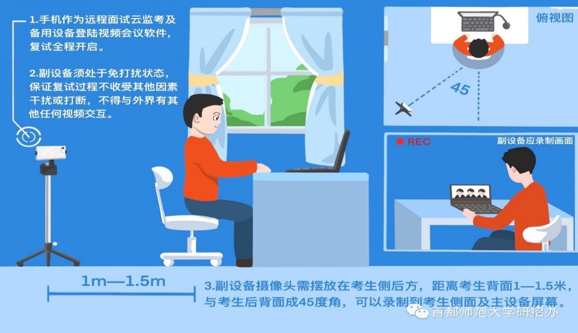 3.準(zhǔn)備支持“雙機(jī)位”模式的軟硬件,包括2部帶攝像頭的設(shè)備,支持高清視頻通話的電腦或智能手機(jī)均可。第一機(jī)位設(shè)備擺放于考生正面,用于登錄首都師范大學(xué)網(wǎng)絡(luò)遠(yuǎn)程復(fù)試平臺(tái)(https://www.yjszsms.com/school/10028),盡量使用電腦;第二機(jī)位設(shè)備擺放于考生側(cè)后方45°,安裝最新版“釘釘”軟件(建議版本為6.3.25-Release.3019101),可使用電腦或手機(jī)。