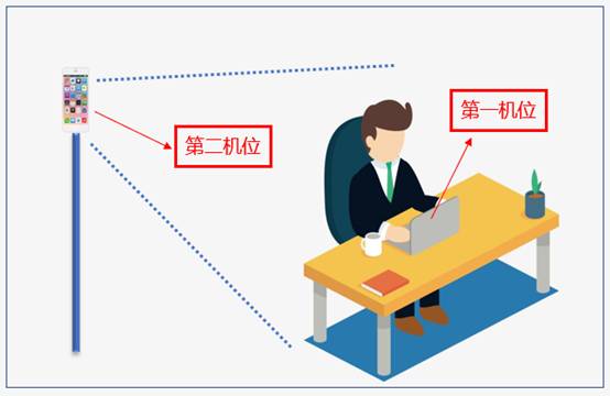 ⒊ 考生根據(jù)工作人員要求進(jìn)行視頻角度及清晰度調(diào)整。兩套設(shè)備中,第一套設(shè)備為主設(shè)備,要求放置在考生座位正前方,視頻監(jiān)控范圍應(yīng)保證考生在坐姿狀態(tài)下能夠完整清晰覆蓋頭部到桌面位置,用于系統(tǒng)進(jìn)行人臉識(shí)別、身份驗(yàn)證等;另一套為輔助設(shè)備,放置于考生右后方45度位置,確保監(jiān)控范圍覆蓋第一臺(tái)設(shè)備的顯示屏幕和考生本人頭部、背部、手部,標(biāo)準(zhǔn)規(guī)范參考下圖。