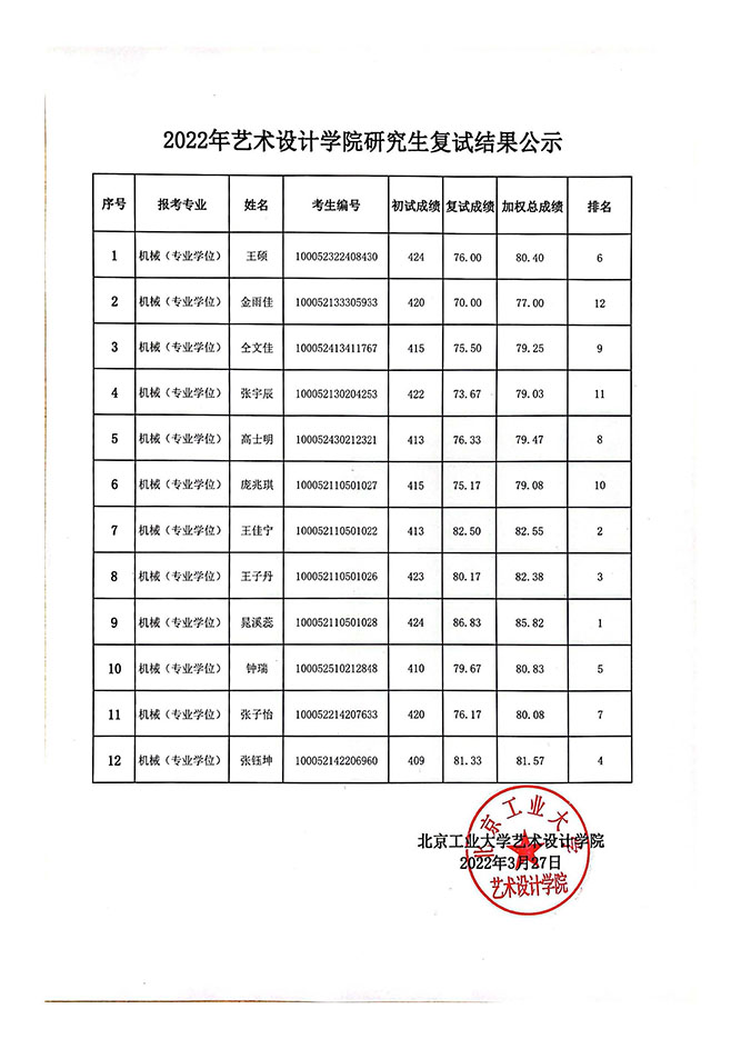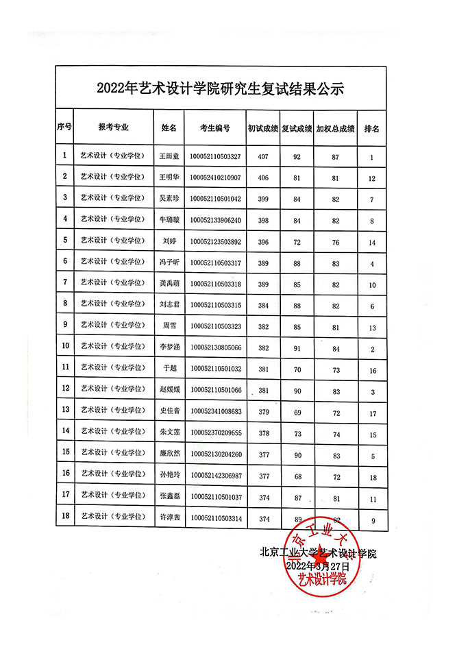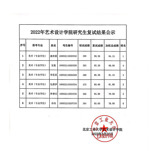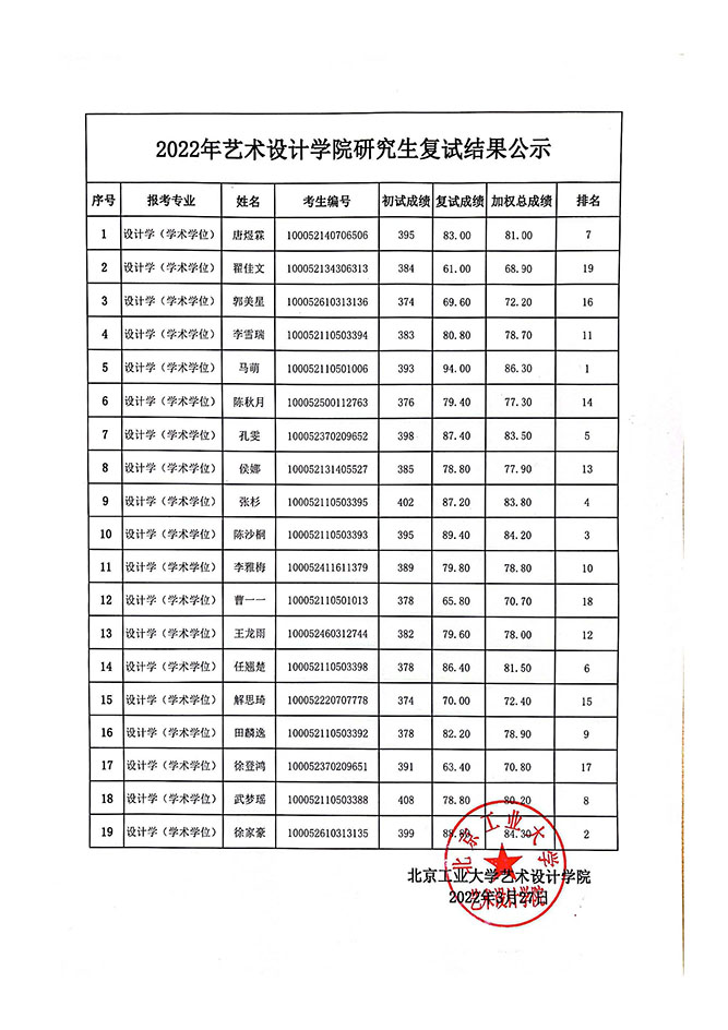 北京工業(yè)大學(xué)藝術(shù)設(shè)計(jì)學(xué)院2022年考研復(fù)試結(jié)果公示 發(fā)布時(shí)間:2022-03-27 北京工業(yè)大學(xué)藝術(shù)設(shè)計(jì)學(xué)院2022年考研復(fù)試結(jié)果公示 上一篇:北京工業(yè)大學(xué)藝術(shù)設(shè)計(jì)學(xué)院2022年考研復(fù)試安排(專(zhuān)碩) 下一篇:北京工業(yè)大學(xué)2023年保研(推免生)招生安排