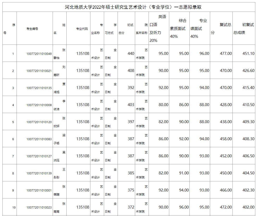 河北地質(zhì)大學(xué)2022年考研擬錄取名單(藝術(shù)設(shè)計(jì)) 發(fā)布時(shí)間:2022-03-30 河北地質(zhì)大學(xué)2022年考研擬錄取名單(藝術(shù)設(shè)計(jì)) 上一篇:河北地質(zhì)大學(xué)藝術(shù)學(xué)院2022年考研復(fù)試成績公示 下一篇:河北地質(zhì)大學(xué)藝術(shù)學(xué)院2023年考研招生目錄