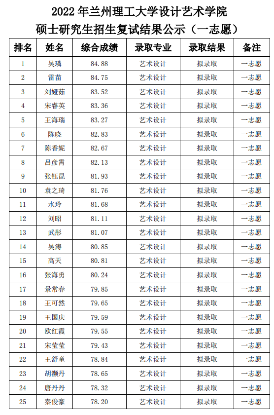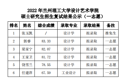 蘭州理工大學(xué)設(shè)計藝術(shù)學(xué)院2022年考研錄取名單(一志愿) 發(fā)布時間:2022-04-04 蘭州理工大學(xué)設(shè)計藝術(shù)學(xué)院2022年考研錄取名單(一志愿) 上一篇:蘭州理工大學(xué)設(shè)計藝術(shù)學(xué)院2022年考研招生目錄及參考書目 下一篇:蘭州理工大學(xué)設(shè)計藝術(shù)學(xué)院2022年考研調(diào)劑錄取名單