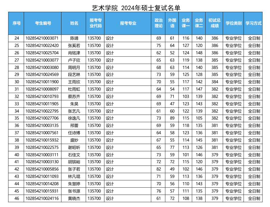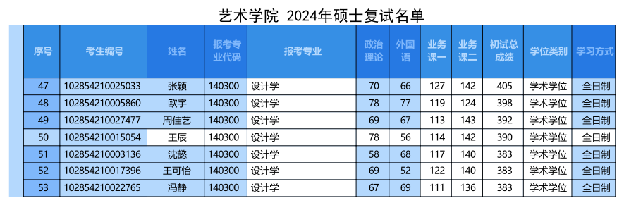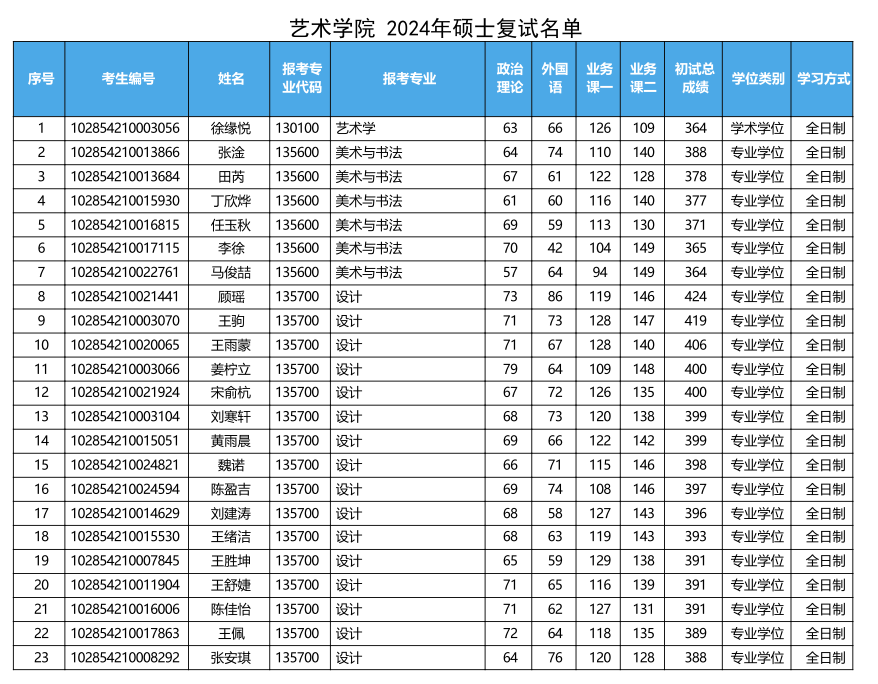 蘇州大學(xué)藝術(shù)學(xué)院2024年考研復(fù)試名單 發(fā)布時間:2024-03-22 蘇州大學(xué)藝術(shù)學(xué)院2024年考研復(fù)試名單 上一篇:蘇州大學(xué)藝術(shù)學(xué)院2024年考研復(fù)試分?jǐn)?shù)線及招生人數(shù)發(fā)布 下一篇:蘇州大學(xué)藝術(shù)學(xué)院2024年考研錄取名單