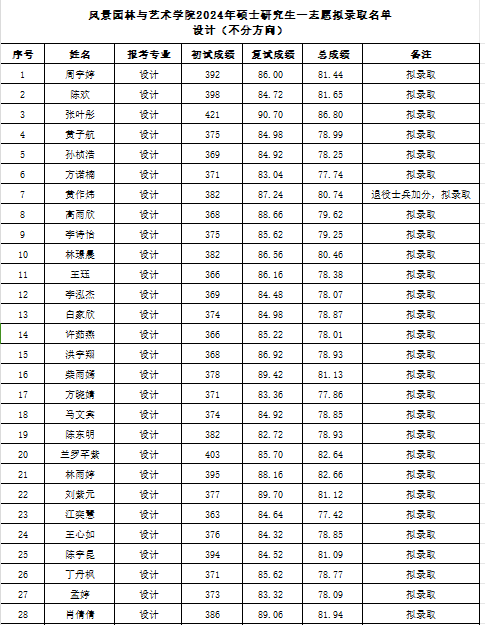 福建農(nóng)林大學(xué)2024年考研復(fù)試錄取名單 發(fā)布時(shí)間:2024-04-03 福建農(nóng)林大學(xué)2024年考研復(fù)試錄取名單 上一篇:福建理工大學(xué)2024年考研復(fù)試名單-設(shè)計(jì)學(xué)/設(shè)計(jì) 下一篇:福建農(nóng)林大學(xué)風(fēng)景園林與藝術(shù)學(xué)院2025年保研推薦名單公示