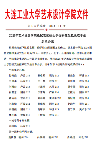 大連工業(yè)大學藝術設計學院2025年保研研究生錄取名單 發(fā)布時間:2024-09-01 大連工業(yè)大學藝術設計學院2025年保研研究生錄取名單 上一篇:大連工業(yè)大學藝術設計學院2024年考研復試錄取名單 下一篇:大連工業(yè)大學藝術設計學院2025年考研招生目錄及參考書目