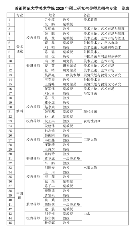 首都師范大學(xué)美術(shù)學(xué)院2025年碩士研究生導(dǎo)師及招生專業(yè)一覽表 發(fā)布時(shí)間:2024-09-23 首都師范大學(xué)美術(shù)學(xué)院2025年碩士研究生導(dǎo)師及招生專業(yè)一覽表 上一篇:首都師范大學(xué)美術(shù)學(xué)院2025年保研招生工作辦法 下一篇:首都師范大學(xué)美術(shù)學(xué)院 2025年免試攻讀碩士研究生復(fù)試名單