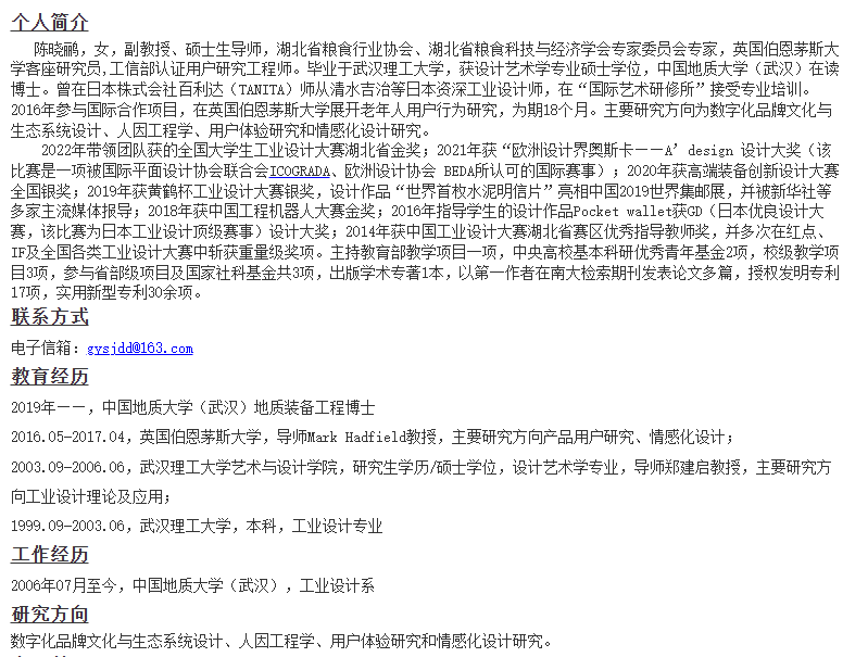 中國地質(zhì)大學(xué)(武漢)工業(yè)設(shè)計導(dǎo)師簡介 發(fā)布時間:2024-09-01 中國地質(zhì)大學(xué)(武漢)工業(yè)設(shè)計導(dǎo)師簡介 上一篇:中國地質(zhì)大學(xué)(武漢)機(jī)械與電子信息學(xué)院 2025年設(shè)計學(xué)保研招生人數(shù) 下一篇:中國地質(zhì)大學(xué)(武漢)藝術(shù)與傳媒學(xué)院2025年保研面試成績公示