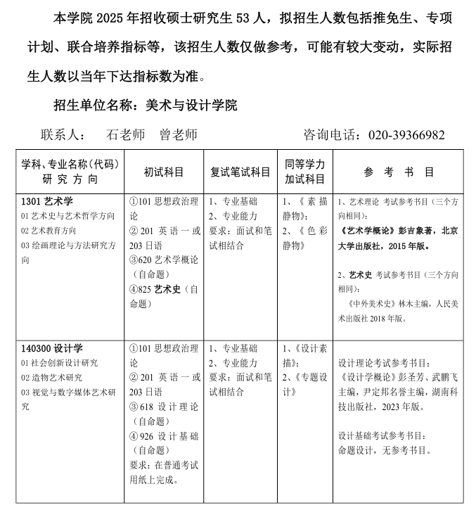 廣州大學美術與設計學院2025年考研招生目錄及參考書目 發(fā)布時間:2024-09-30 廣州大學美術與設計學院2025年考研招生目錄及參考書目 上一篇:廣州大學美術與設計學院2024-2025學年推薦優(yōu)秀應屆本科畢業(yè)生免試攻讀研究生公示 下一篇:廣州大學美術與設計學院2025年保研錄取名單