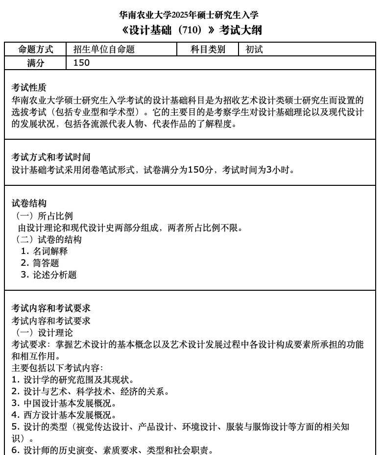華南農(nóng)業(yè)大學(xué)藝術(shù)學(xué)院2025年考研參考書目及考試大綱:710設(shè)計基礎(chǔ)