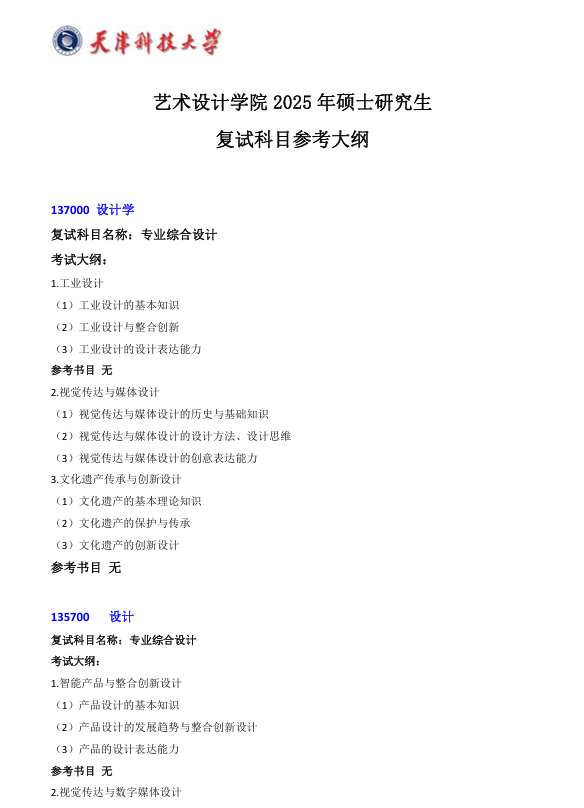 天津科技大學藝術(shù)設(shè)計學院2025年考研復試科目考試大綱 發(fā)布時間:2025-03-07 上一篇:天津科技大學藝術(shù)學院2025年保研錄取名單 下一篇:天津科技大學2025年工業(yè)設(shè)計工程考研復試科目考試大綱
