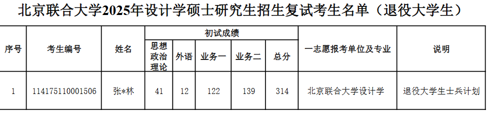 北京聯(lián)合大學藝術學院2025年考研復試名單 發(fā)布時間:2025-03-19 北京聯(lián)合大學藝術學院2025年考研復試名單 上一篇:北京聯(lián)合大學藝術學院2025年考研復試分數(shù)線發(fā)布:設計學140300/設計135700 下一篇:北京聯(lián)合大學藝術學院2025年考研錄取名單(一志愿)