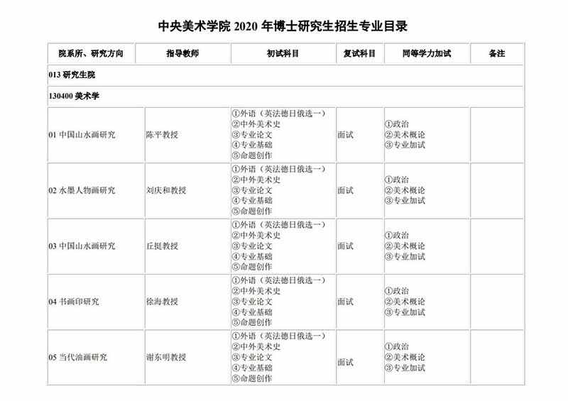 中央美術(shù)學(xué)院2020年博士研究生專業(yè)目錄 發(fā)布時間:2019-11-05 中央美術(shù)學(xué)院2020年博士研究生專業(yè)目錄 上一篇:中央美術(shù)學(xué)院2019年考研錄取名單 下一篇:中央美術(shù)學(xué)院2020年考研錄取名單公示